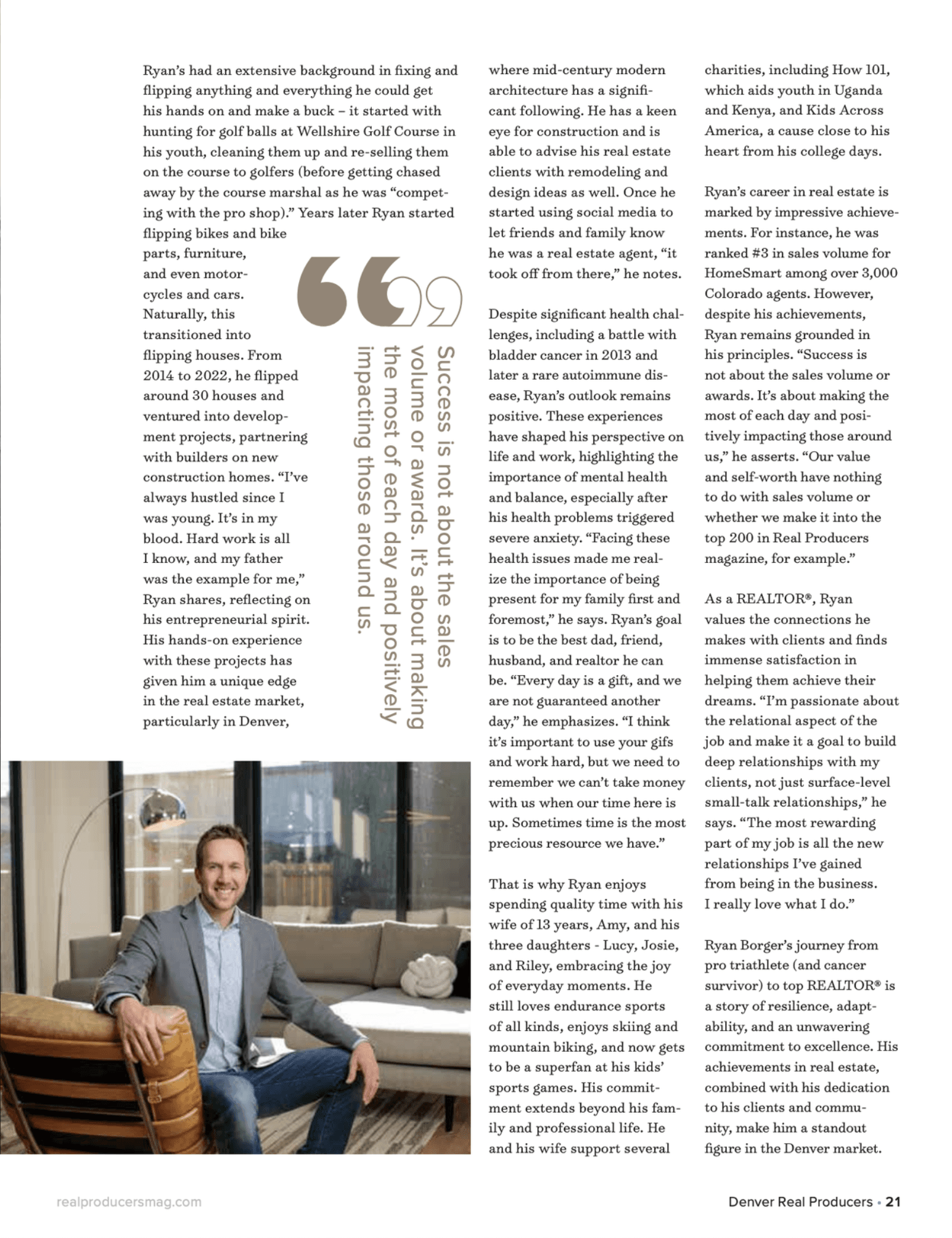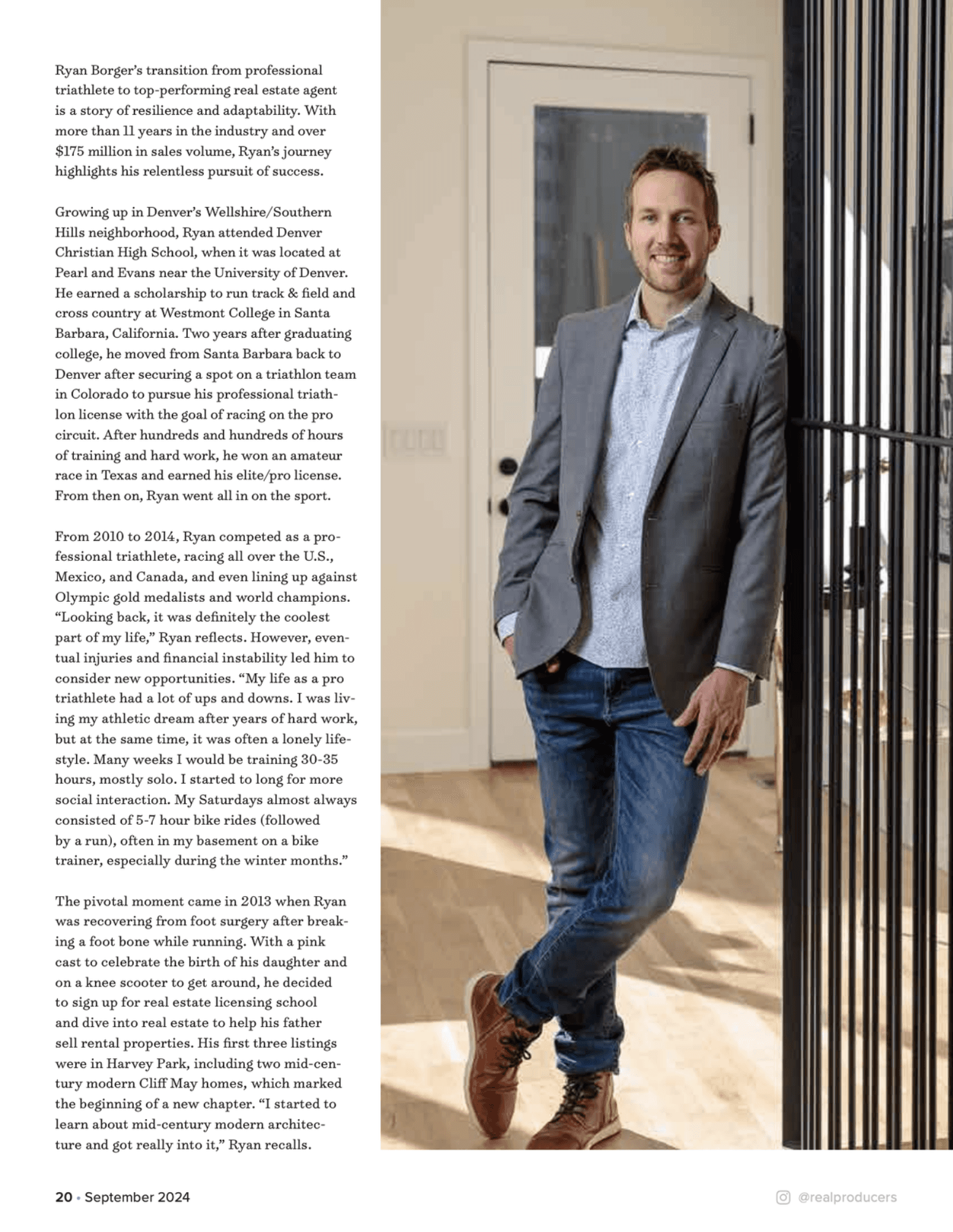 In September 2024, Denver Real Producers magazine honored Ryan as their Agent of the Month, spotlighting his outstanding achievements and leadership in the real estate industry. The feature, which reached newsstands and mailboxes across the entire Denver metro area, highlighted Ryan’s exceptional client service, innovative marketing strategies, and consistent top-tier performance. The article offered readers a deeper look into Ryan’s professional journey, community involvement, and the values that set him apart in one of the nation’s most competitive real estate markets.