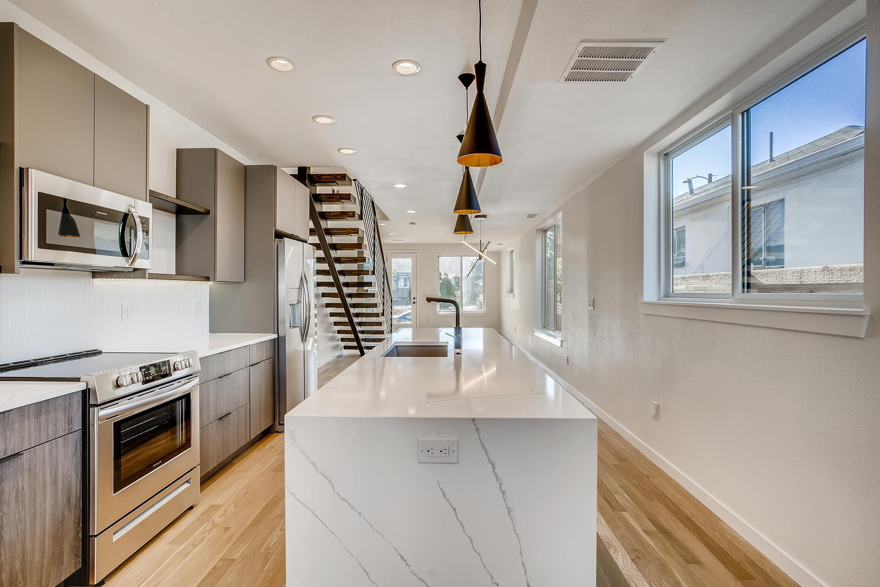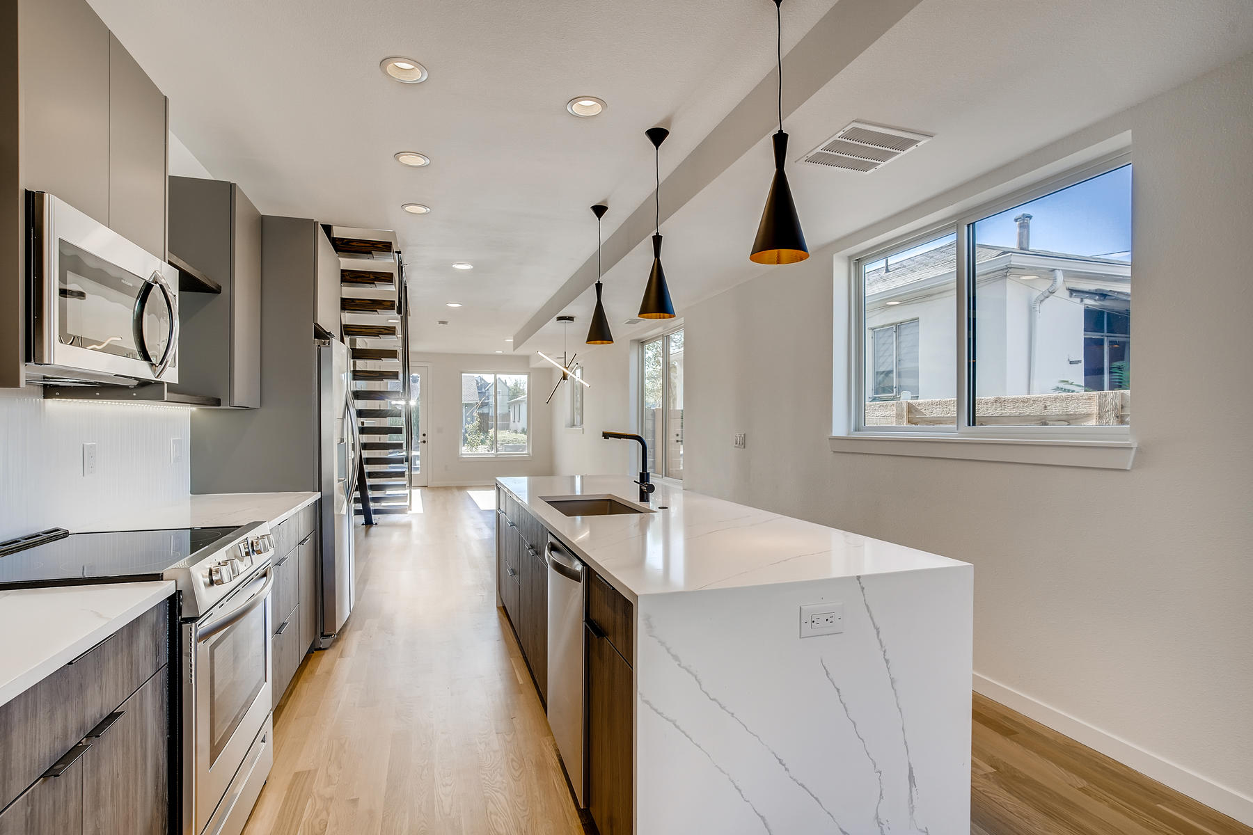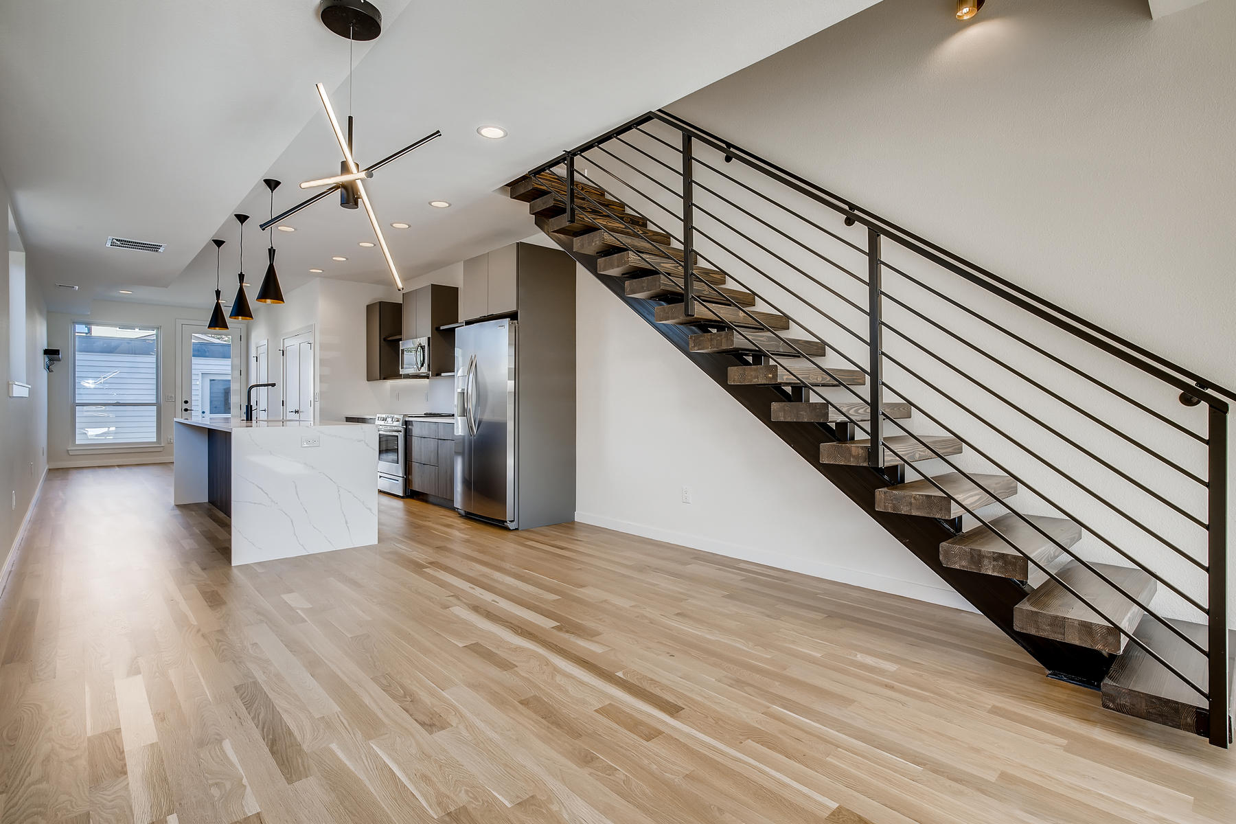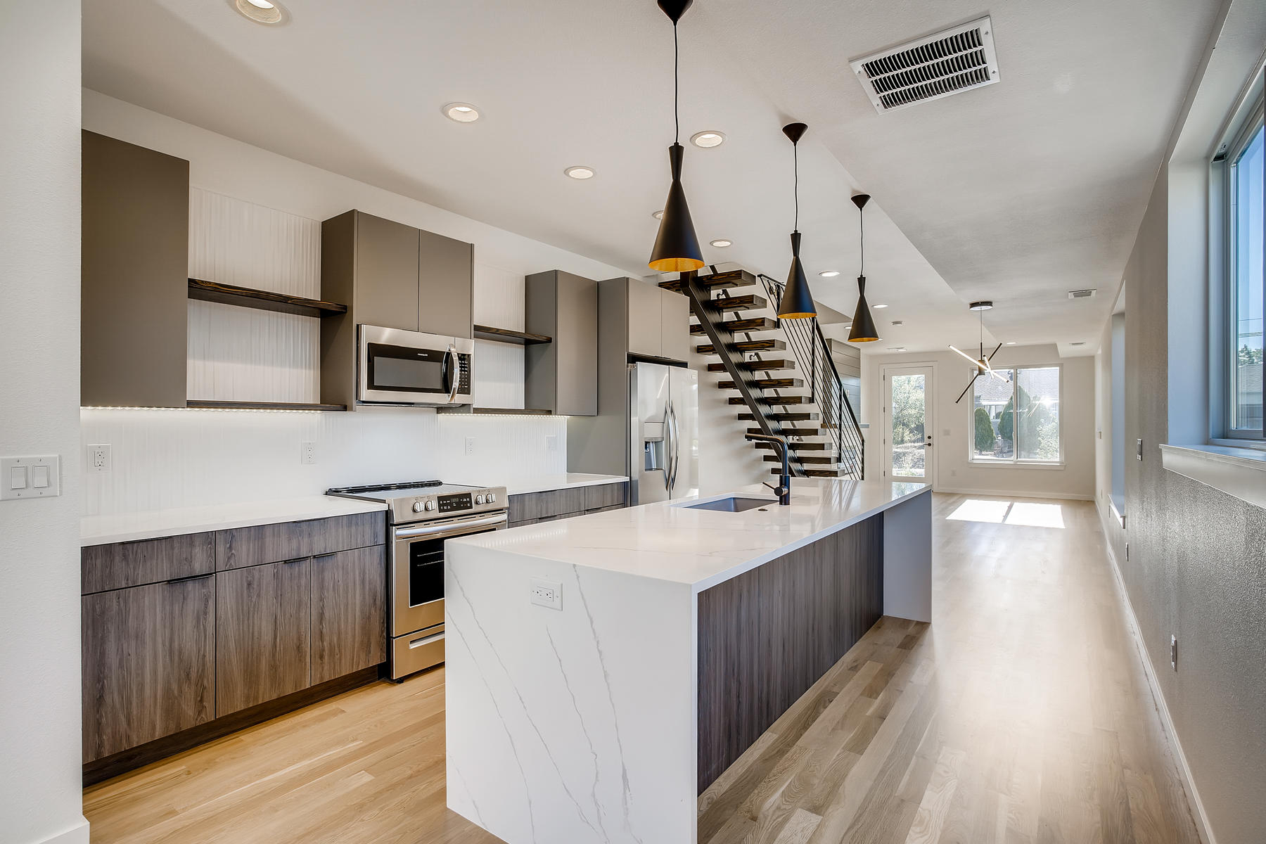 odern 3 bed/4 bath new construction attached home (1 unit of 3-plex) in Denver's hot Rosedale/Overland neighborhood. 3 stories of functional living space with walk-out west facing rooftop balcony. Main floor features a large kitchen with pantry, eat-in waterfall quartz island, modern cabinetry, tile backsplash, stainless appliances, & more. Custom monorail staircase with floating wood stair treads. Living room with oak hardwoods, electric fireplace, mantel & tile surround. Master w/large closet & ensuite bath with double vanity. Andersen windows. 3rd floor features a large bedroom, 3/4 bath, flex/party room with wet bar & a large west facing balcony with mountain views. 2 car detached garage. Back yard patio. Sprinkler system. Central A/C. High efficiency furnace & water heater. No HOA. Less than 1/4 mile from Evans light rail station. Close to shops on Broadway, DU, Platte Park/Wash Park & more. Taxes have not yet been assessed; buyer to verify taxes. Buyer to verify square footage. Photos on listing are of other unit(s) with similar finishes.