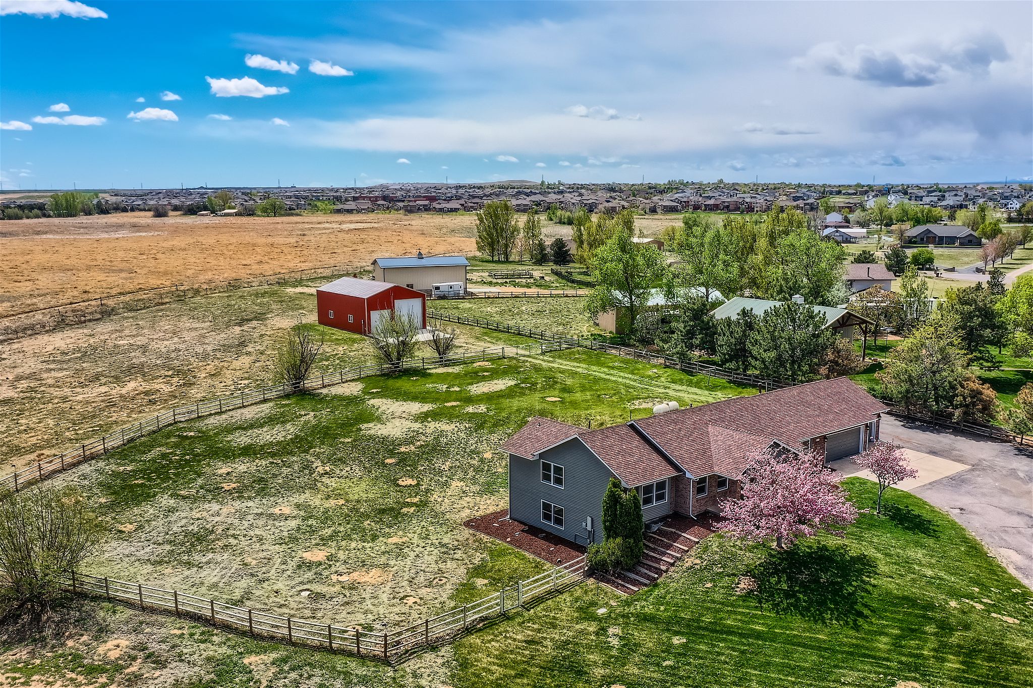 Homes in Columbine Ranches rarely come available for sale. One of the best and most private lots in Columbine Ranches on cul-de sac. This updated ranch with walk-out basement offers an updated kitchen with new cabinets, island with plenty of cabinet storage, granite countertops, stainless single bowl sink, tile backsplash & new stainless steel appliances including a double oven range. Large dining room & huge closet style panty with barn doors. Excellent living room with tall ceilings & gas fireplace. New septic tanks installed Feb. 2025. New 50 gallon water heater installed May 2024. Large oversized drywalled 3 car attached garage + a huge 1470 square ft outbuilding/barn (new in 2020) with oversized garage doors for RV/camper storage. Main floor primary bedroom features a walk-in closet and updated 5 piece ensuite primary bath with jetted tub. Two laundry room options (main level & basement). Also new interior & exterior paint. New carpet. New luxury vinyl plank flooring. Huge exterior composite deck off the main floor with beautiful views. Large driveway with tons of room for additional parking. HOA provides community well for irrigation water. Private well on property for household use. A-1 zoning.