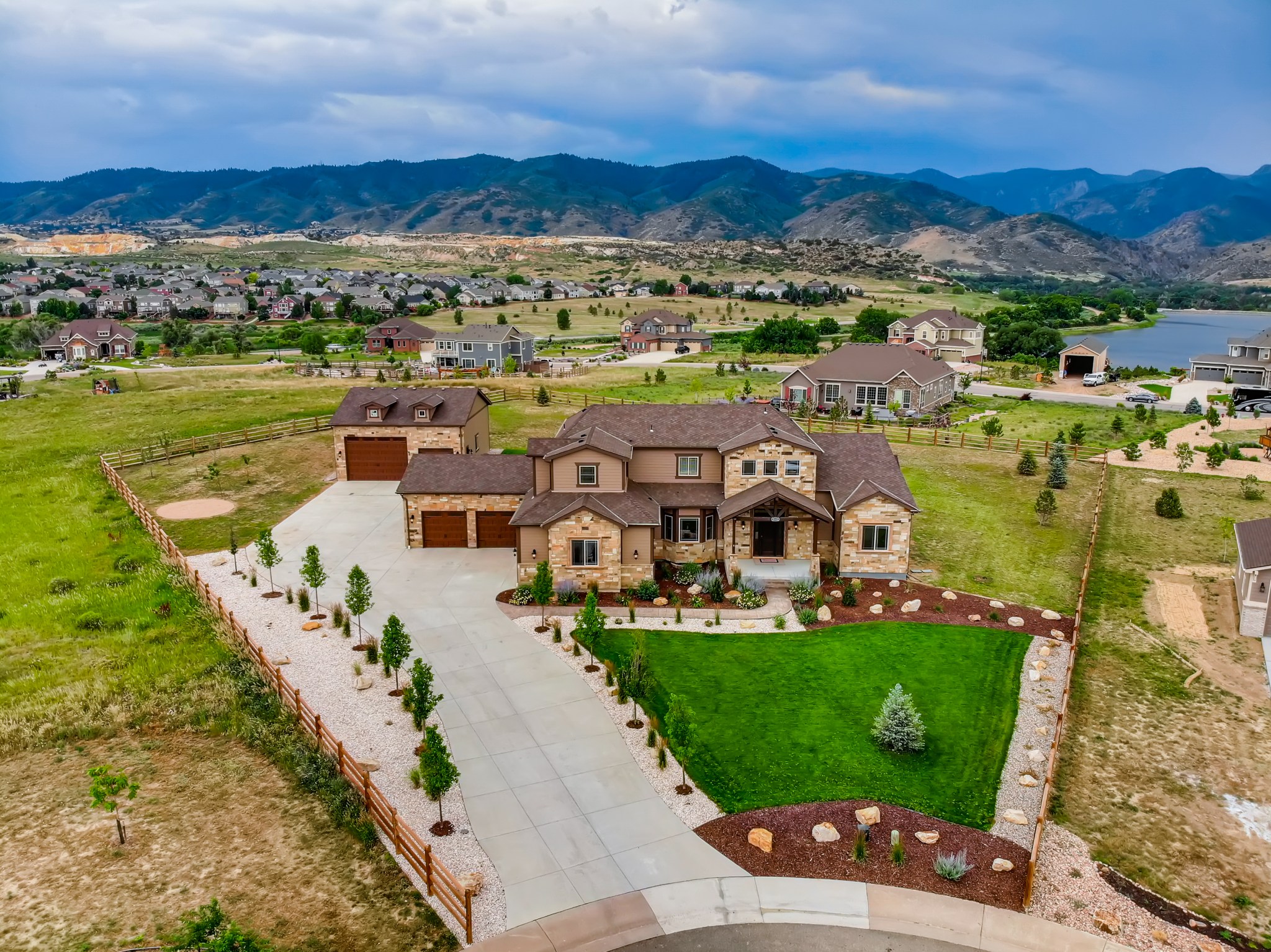 Welcome to the largest & most spectacular luxury residence in The Estates of Chatfield Farms. With over 8000 total square feet, this home features 6 bedrooms, 6 bathrooms, 2 kitchens, a home theater with wet bar, $100k designer kitchen, two attached 2-car garages plus an enormous detached 40 foot deep (& 14 ft tall) RV/car collector bonus garage, & much more. Built in 2018, this newer construction home sits on a large over 1 acre cul-de-sac lot with large yard & excellent views of the foothills.